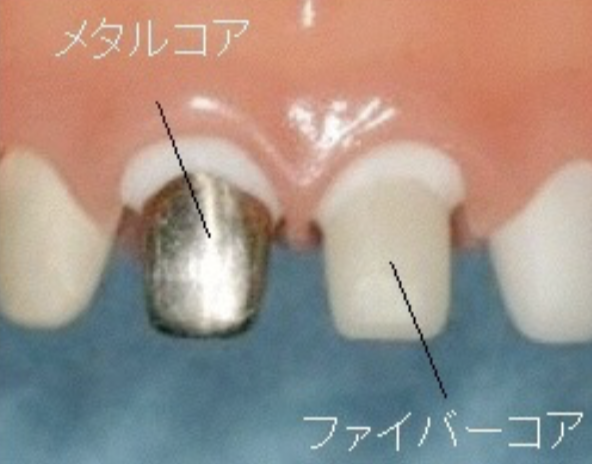 歯の根っこの治療が終わったら、次は歯を被せていく処置に入ります。従来の保険の治療では、メタルコア(金属の土台)を作ってクラウン(被せ物)を装着します。しかし、金属は歯の根っこよりも硬いため、強い力が加わると歯が割れてしまう事が多いです。 そこで、歯と同じ強度のファイバーコア(グラスファイバーで作製した土台)を装着する事で、強い力が加わっても歯がしなるため、歯が割れにくく長持ちします。 特に上の前歯は、下の歯が斜めから咬み込んでくるため、割れやすいです。上の前歯に被せ物をする場合はファイバーコアをお勧めします。